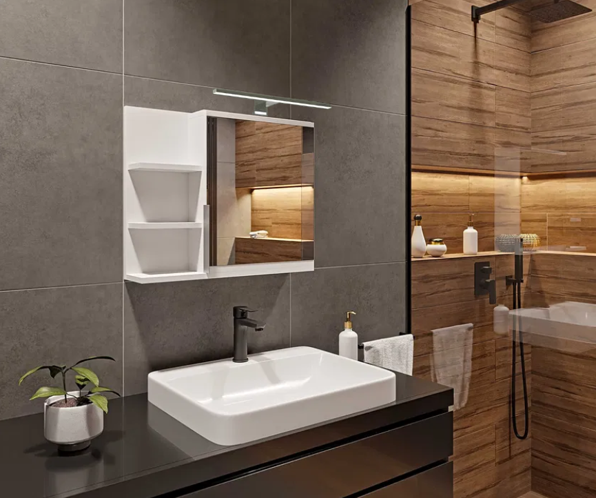 Modna i funkcjonalna biała szafka łazienkowa z lustrem, półkami i oświetleniem LED