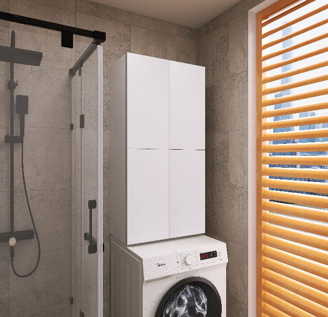 Szafka została zaprojektowana z myślą o montażu bezpośrednio nad pralką, co pozwala zagospodarować pionową przestrzeń, która często pozostaje niewykorzystana. To idealna opcja do małych łazienek, kawalerek czy mieszkań w blokach.