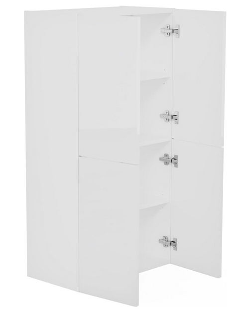 Cztery zamykane fronty kryją w sobie pojemne półki, które pomieszczą środki czystości, detergenty, ręczniki, kosmetyki i inne niezbędne akcesoria. Dzięki temu wszystko masz pod ręką – a jednocześnie ukryte przed wzrokiem.