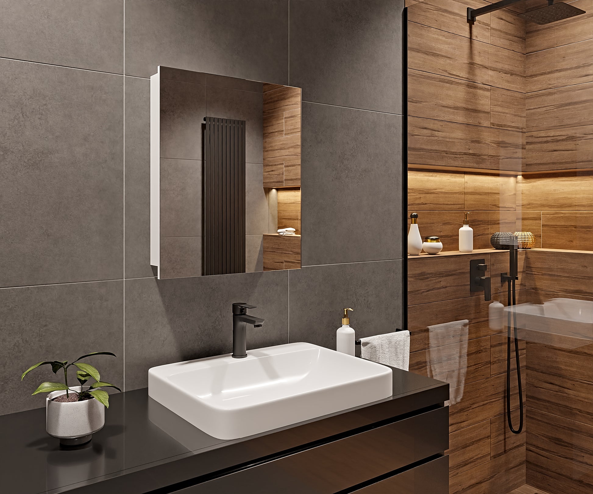 Ta szafka łazienkowa z lustrem świetnie sprawdzi się we wnętrzach w stylu nowoczesnym, skandynawskim czy japandi. Wyróżnia się uniwersalnym wzornictwem, które nie wyjdzie z mody