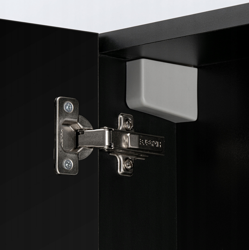 Dzięki innowacyjnym zawiasom z systemem cichego domykania, drzwi zawsze zamykają się delikatnie i bezgłośnie, co chroni zarówno lustro, jak i zawartość szafki przed przypadkowymi uszkodzeniami.