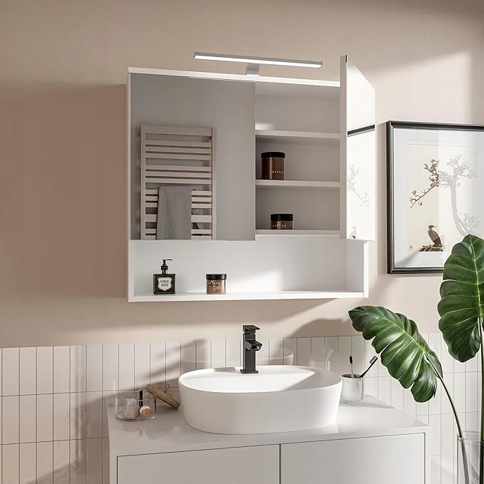 Ta biała szafka łazienkowa z lustrem i LED świetnie sprawdzi się we wnętrzach w stylu nowoczesnym, skandynawskim czy japandi. Wyróżnia się uniwersalnym wzornictwem, które nie wyjdzie z mody